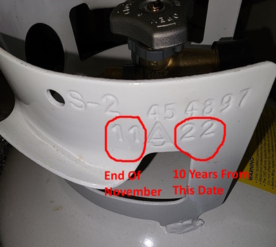 Each cylinder has a month and year stamp on the top flange (the large ring around the top – see our picture). If your tank passes the pressure and visual inspection, then you’ll receive a metal I.D. sticker that’s valid for five years.